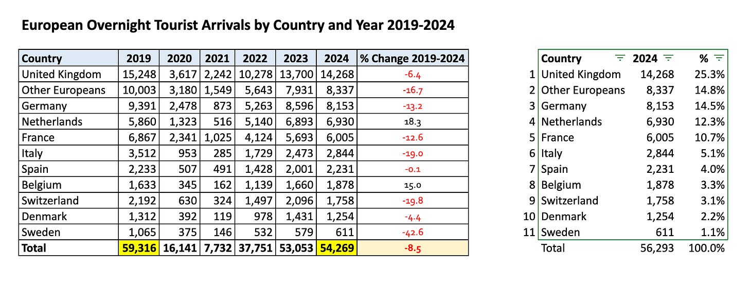 In contrast, Belize welcomed 54,269 European visitors in 2024. That’s three times less. And if you look at Belize’s top European markets: