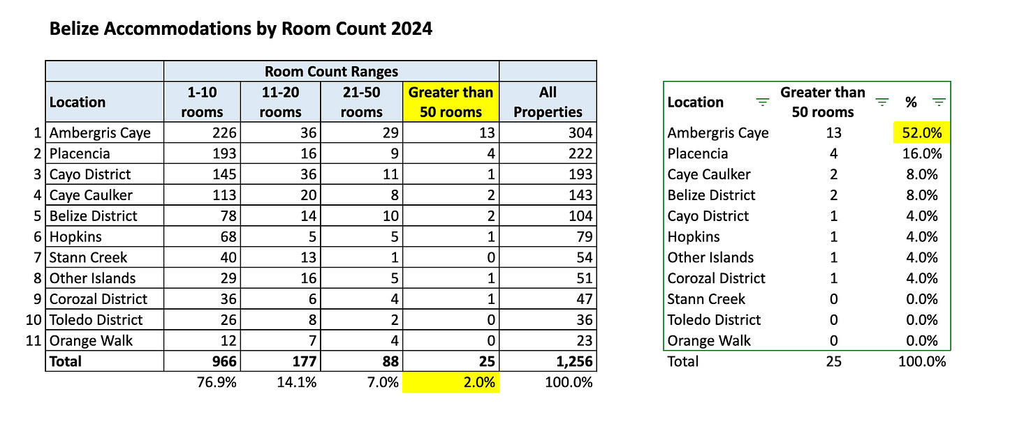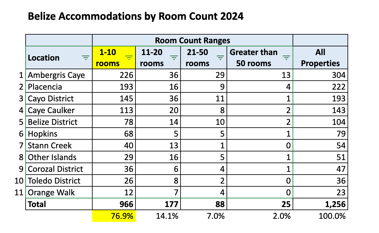 Belize’s accommodation base is overwhelmingly small, and large-scale hotels are rare. Even more telling, the limited number of larger properties that do exist are concentrated in one place: Ambergris Caye (52%). This concentration quietly shapes travel behaviour and the geographic distribution of tourism income.