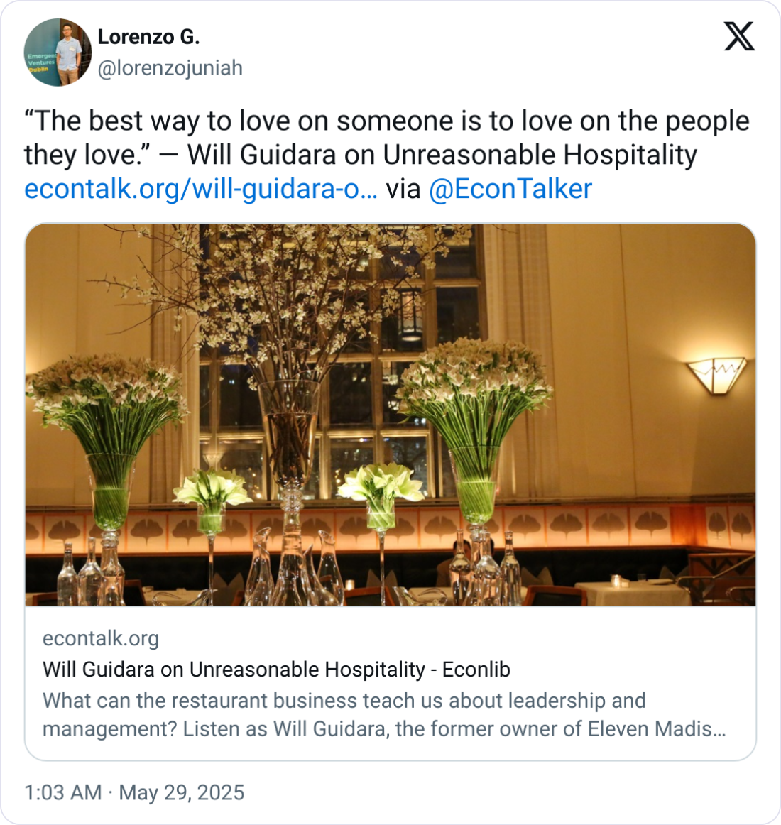 At the end of May I listened to a podcast featuring Will Guidara, former co-owner of Eleven Madison Park, a NYC restaurant once named the best in the world. But what stood out wasn’t the food. It was his philosophy: that hospitality isn’t a department or job title—it’s a choice. A mindset. A culture.