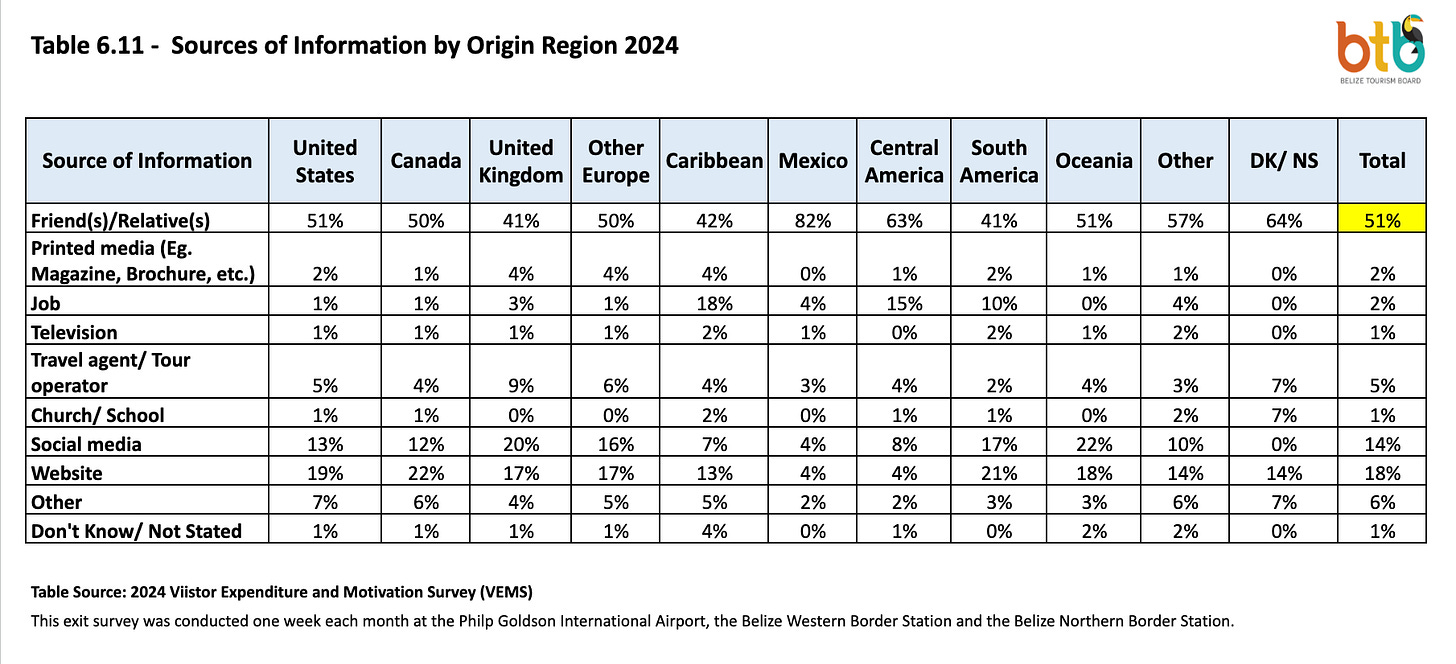 According to the Belize Tourism Board’s 2024 Visitor Expenditure and Motivation Survey, 51% of travelers to Belize said they first learned about the country through friends or relatives—almost three times more than the second-ranked source, websites, at 18%.