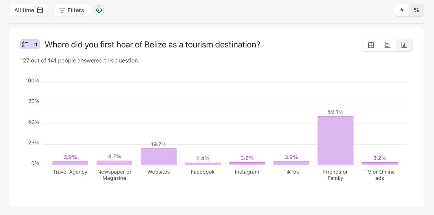 My own year-long survey at Belize Adventure found nearly identical results: 59.1% of visitors said they first heard about Belize through friends or family, while 19.7% cited websites and 9.5% social media. Together, both datasets show the same truth. People trust real experiences shared by those they know, and those stories—passed through photos, messages, or posts—create emotional connections no advertisement can match.